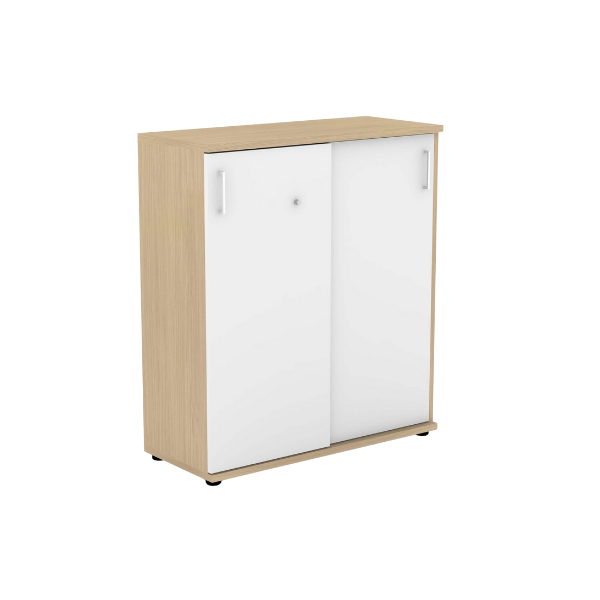 Armoire basse. Dim. : 112x100cm. Portes blanches et corps ambre.